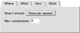 The trickiest is in Smart Refresh. If a site has already been visited by Stamina, Stamina will check that old files are not out of date. For instance, if you select After 1 week, Stamina will check all files that have not been checked for 1 week. Always means "always check". Dumb means "always retrieve document, even if it seams up-to-date" (this may help if your cache is corrupted). Max connections is the maximum number of simultaneous connections to the Internet. |