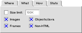 This tells Stamina what to grab. These controls are self-explanatory, except for Non-HTML, which means "follow links to non-HTML files", possibly files like "thebigfile.zip" or stand-alone images. |