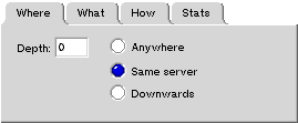 This tells Stamina where to go. If Depth is set to 0, only the page with the given URL will be captured (with its images and all the tra-la-la). If Depth is set to 1, the pages directly linked to this one will be captured, and so on. If Same server is chosen, links to other servers will be ignored, and if Downwards is demanded, only sub-directories of the base directory will be explored. |
